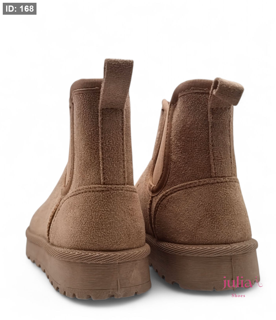 Warm, khaki suede ankle boot, fully lined with faux fur, featuring a thick and comfortable platform sole—perfect for cozy, casual style in cold weather.