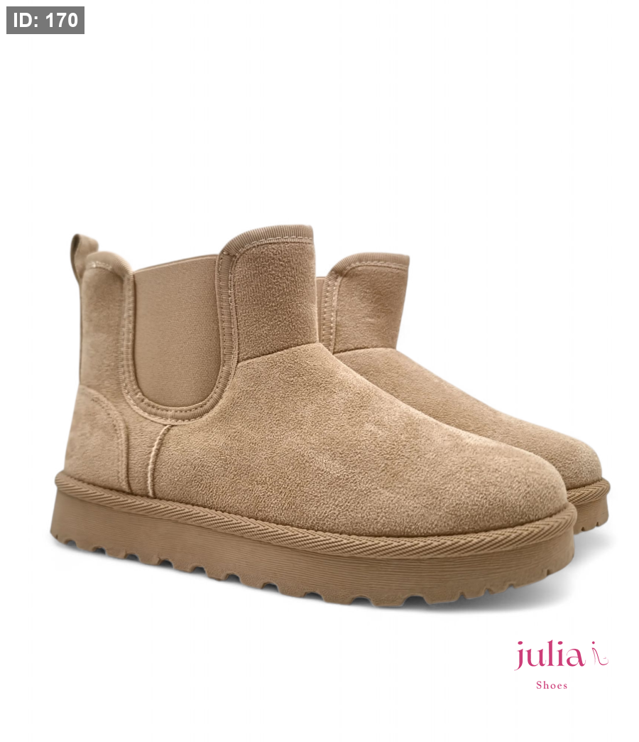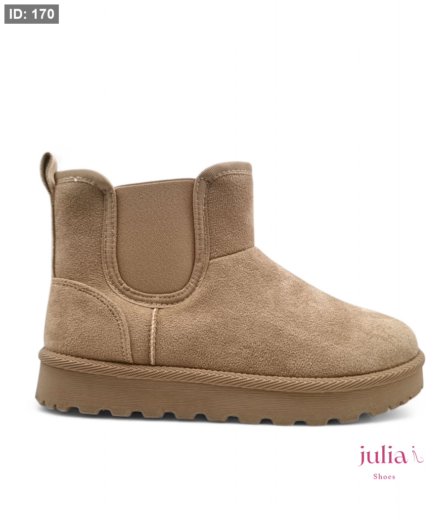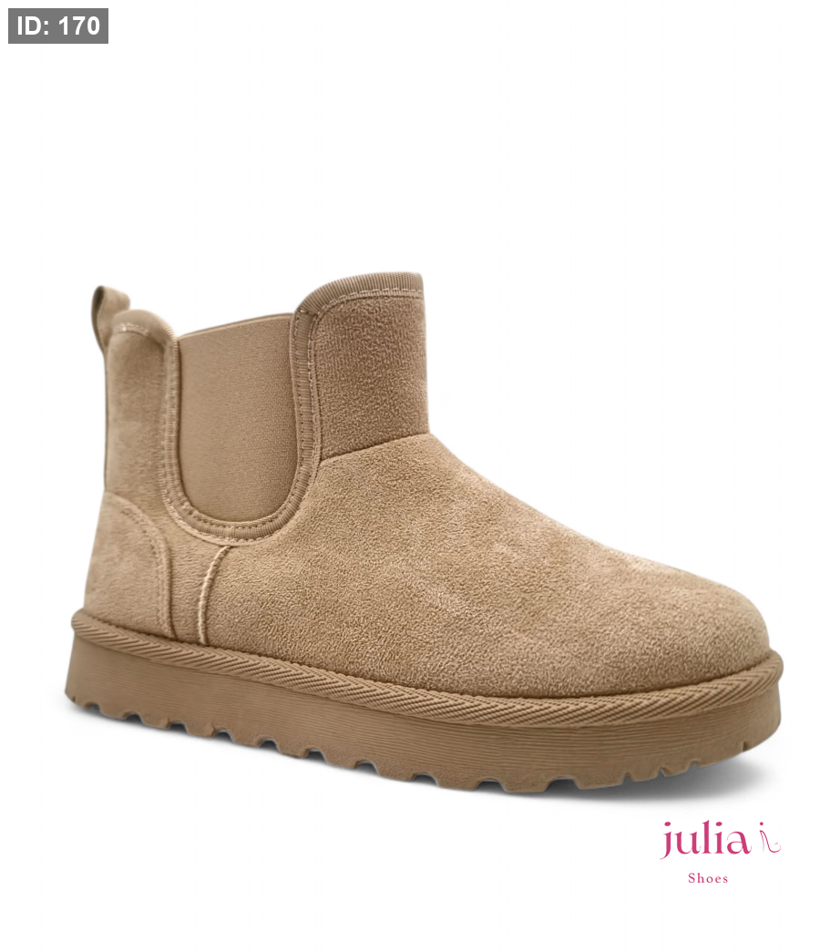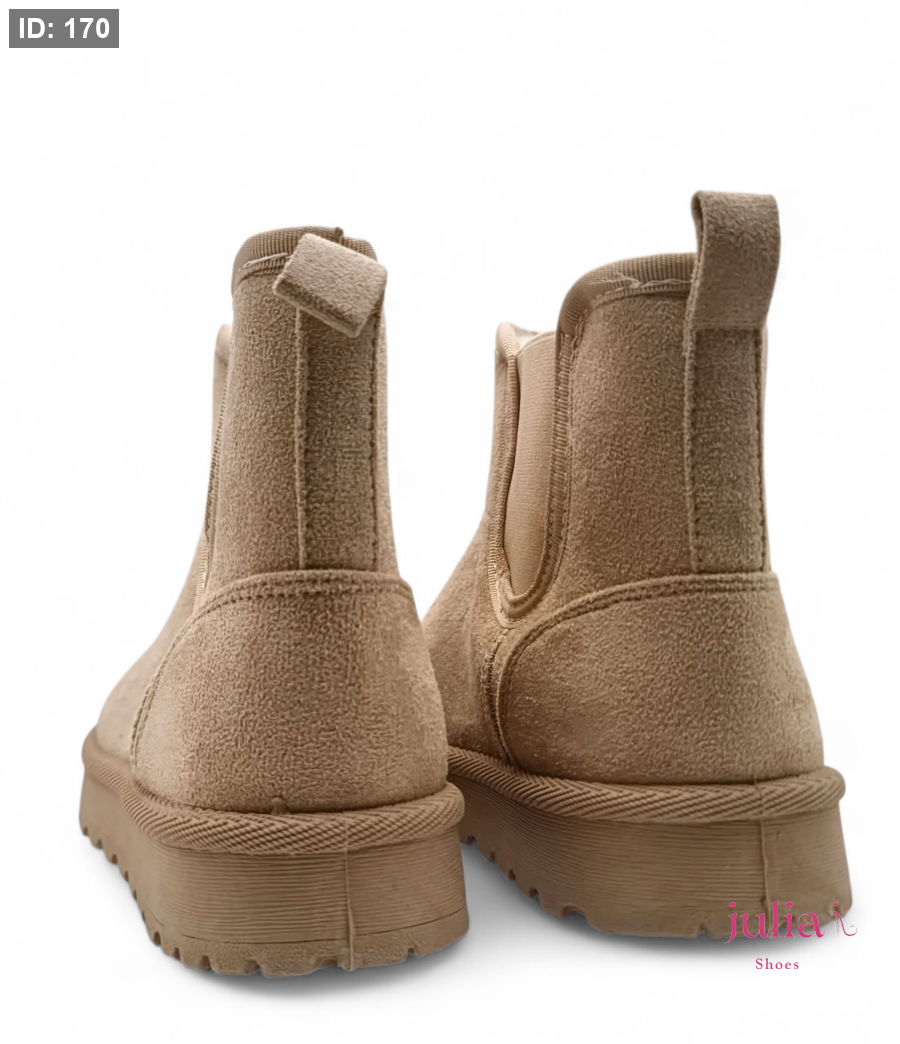 Warm, beige suede ankle boot, fully lined with faux fur, featuring a thick and comfortable platform sole—perfect for cozy, casual style in cold weather.