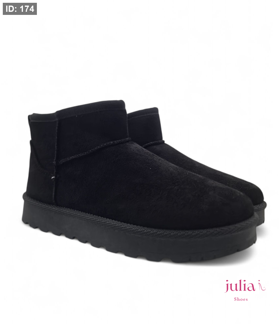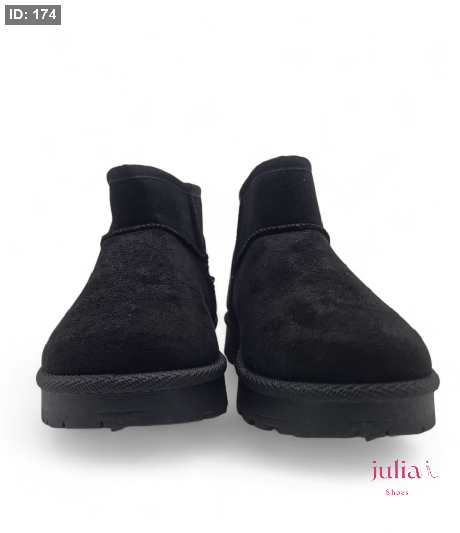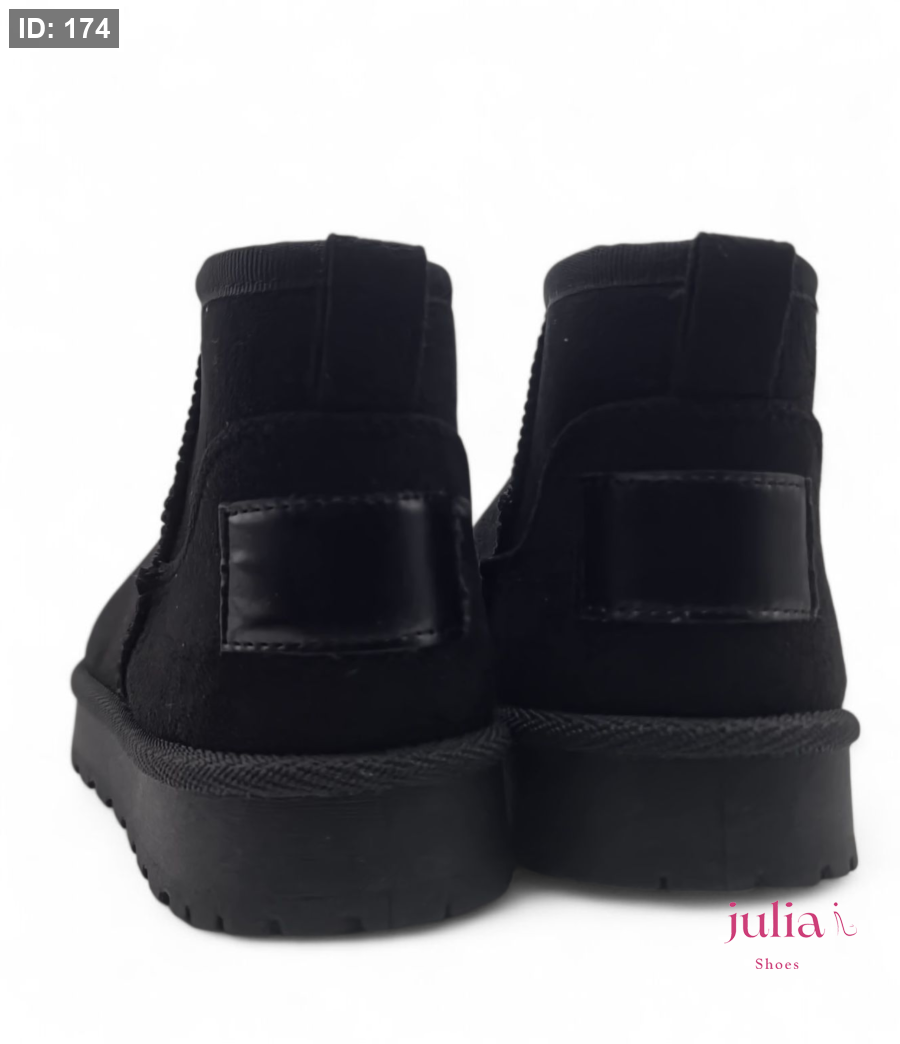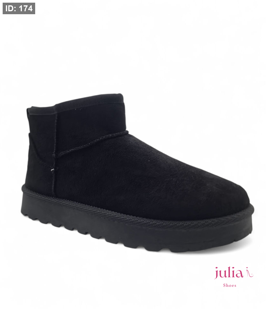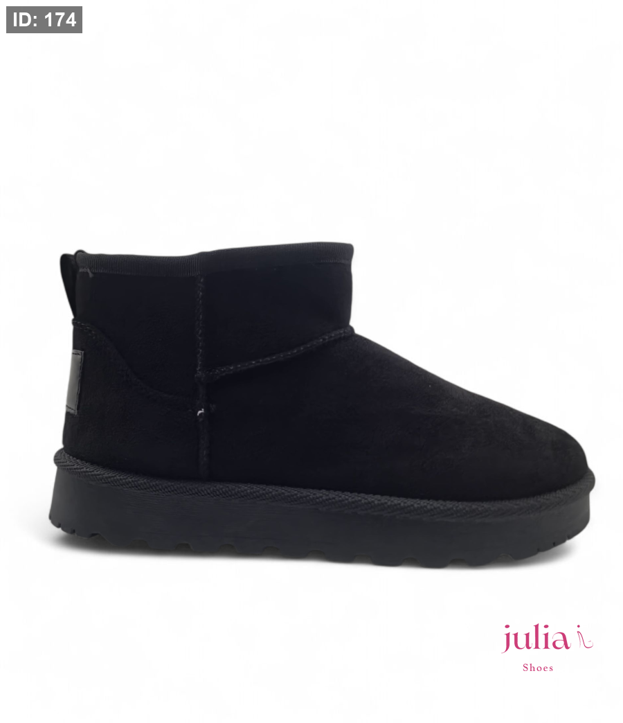 Classic, soft black mini boot made from a suede-like material, featuring a thick and comfortable sole for perfect warmth and versatile casual style in cold weather
