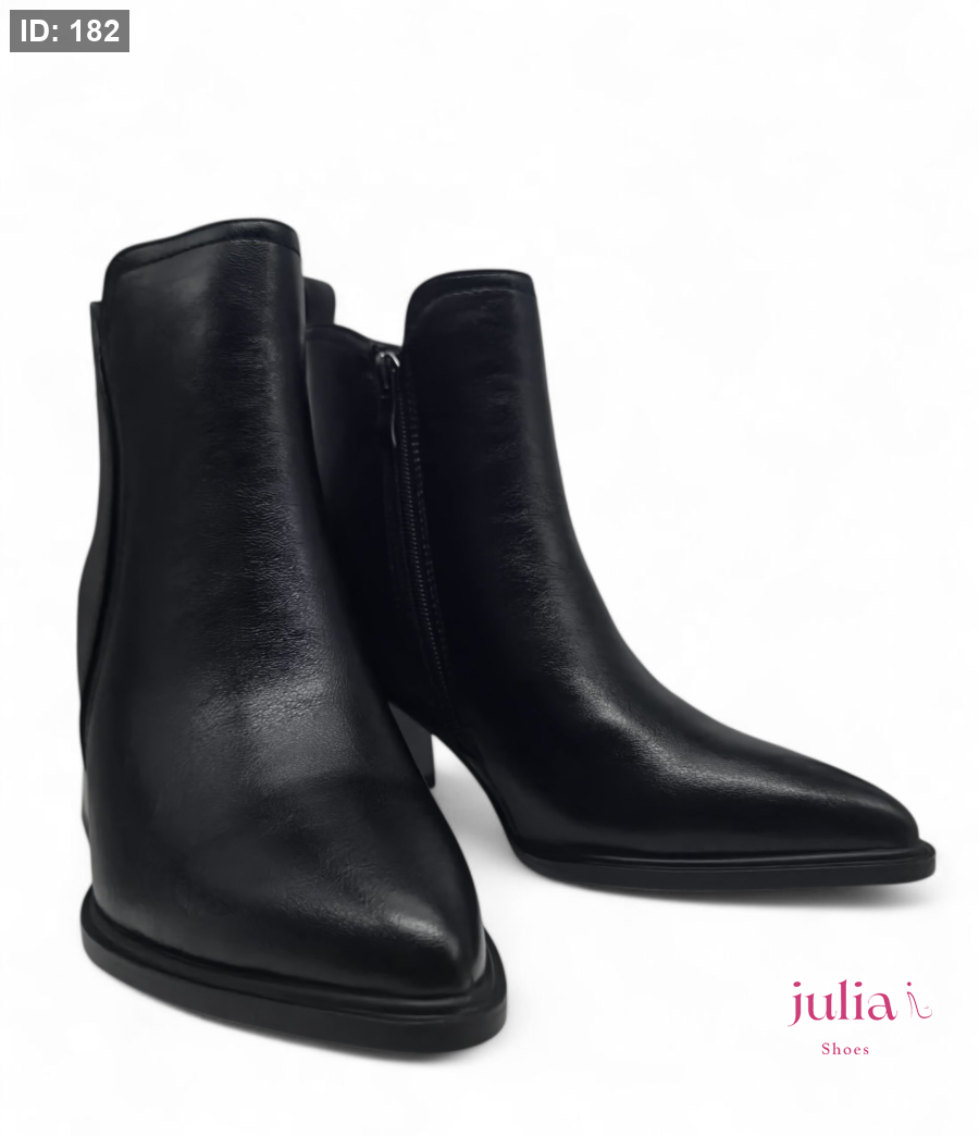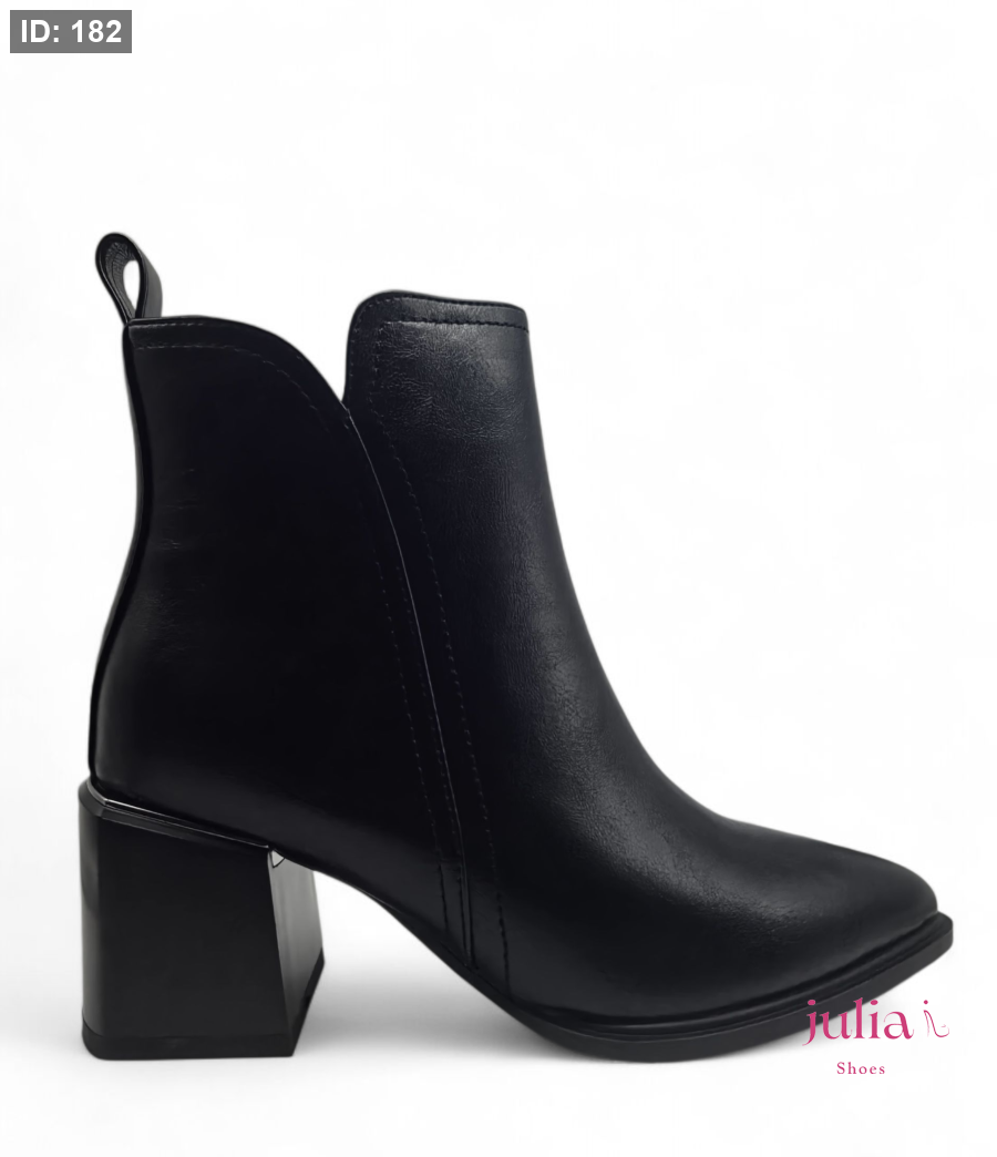 V- CUT ANKLE BOOT WITH METALLIC-ACCENT BLOCK HEEL