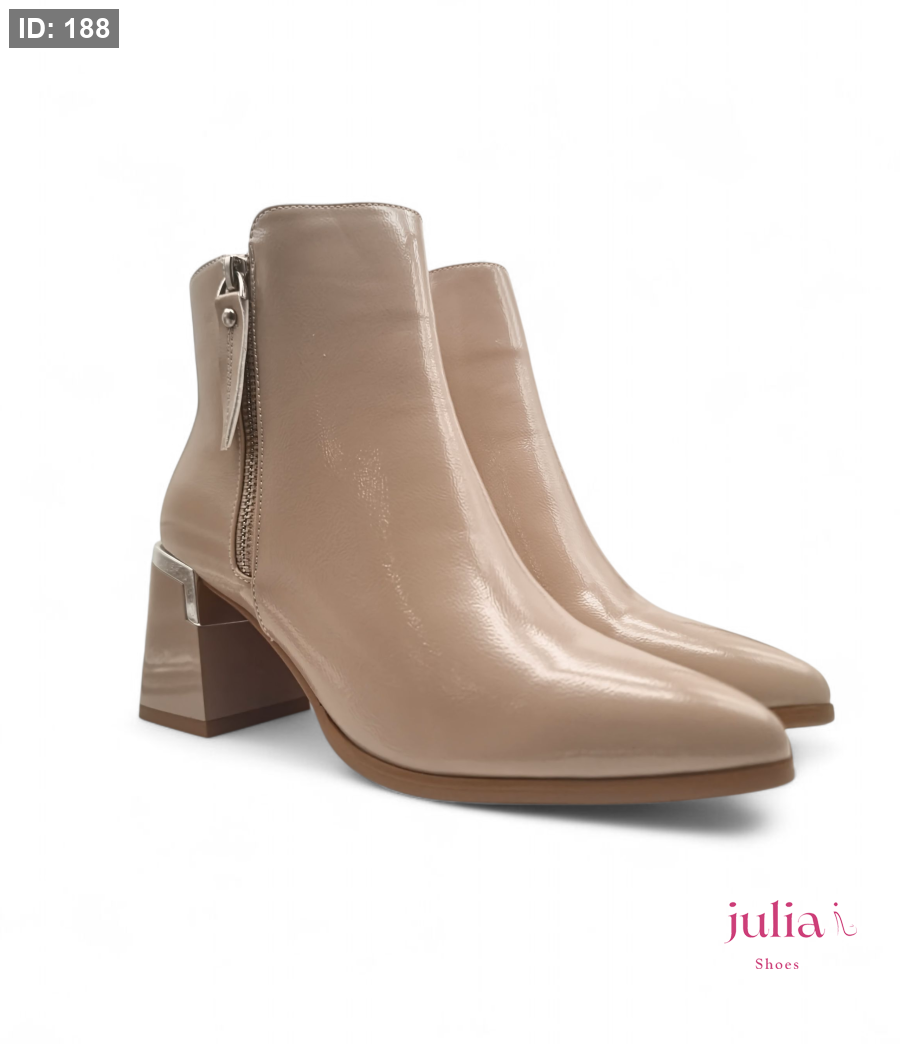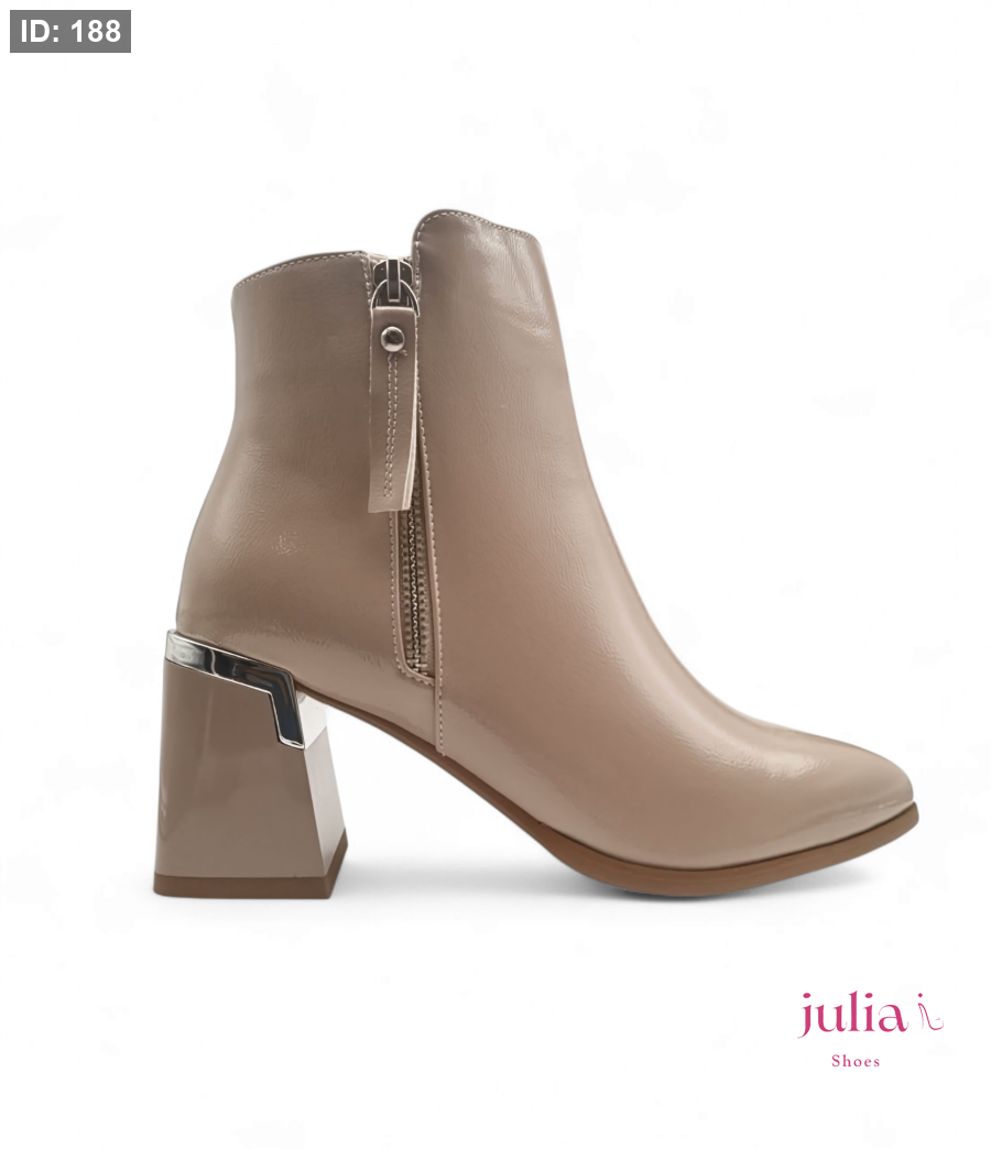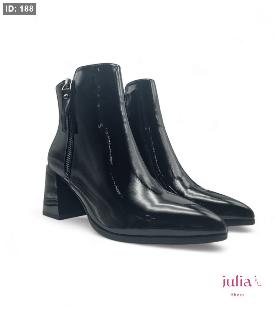 The Patent "Shine" Boot - Bold Luster, Geometric Finish ​Be the center of attention with this glamorous boot! It features a high-shine patent finish that reflects light with captivating brilliance. An exposed side zipper adds a modern edge, while the boot is grounded by a uniquely geometric block heel detailed with a striking metallic accent.