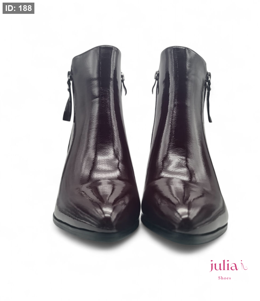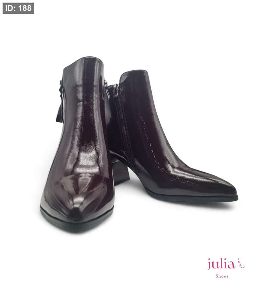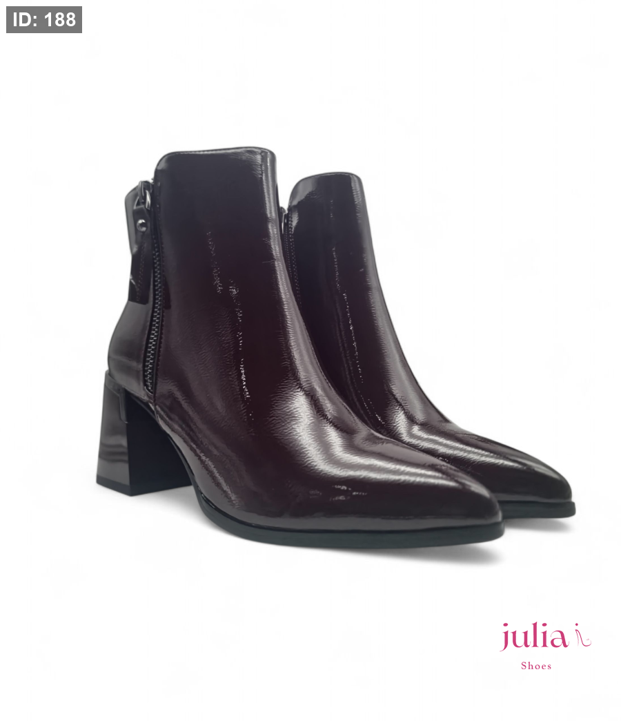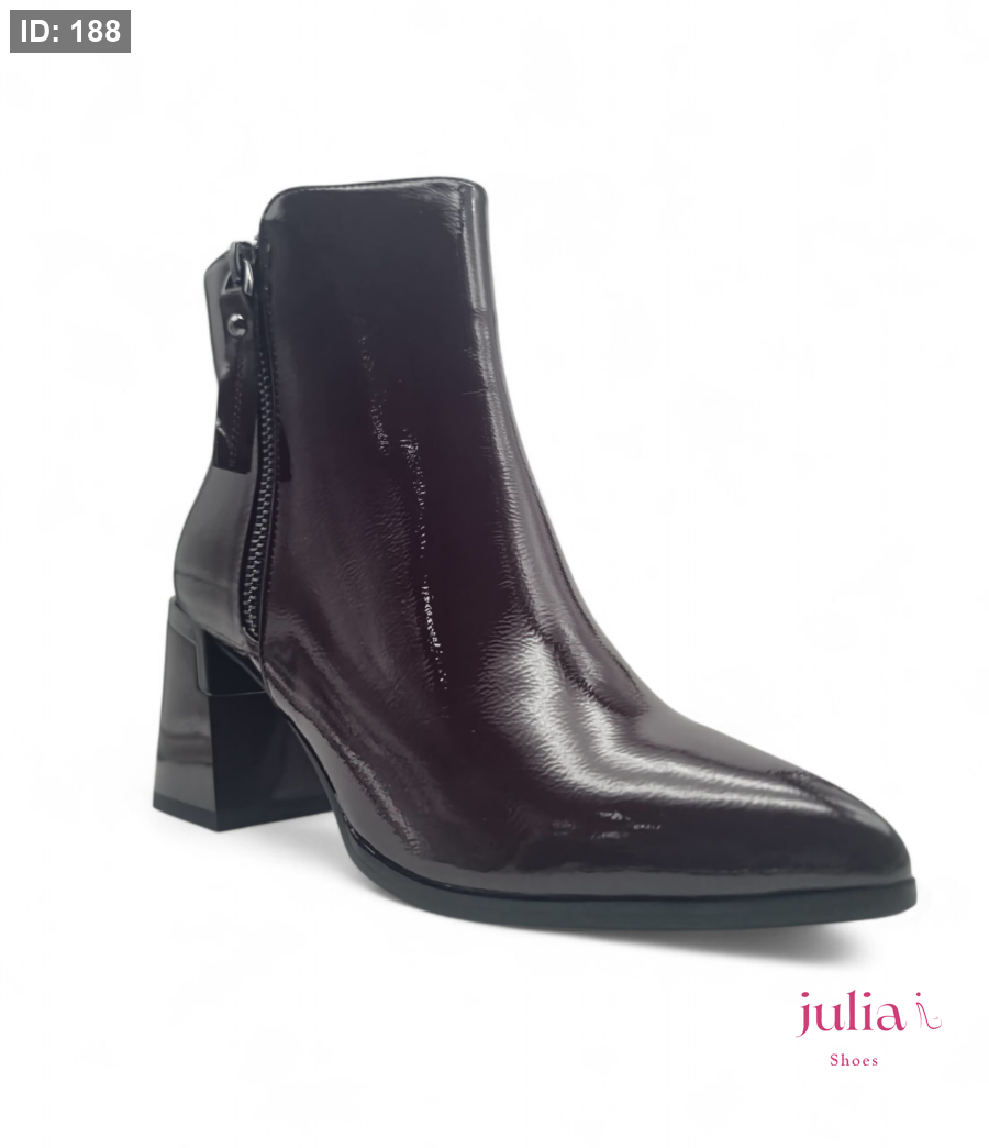 The Patent "Shine" Boot - Bold Luster, Geometric Finish ​Be the center of attention with this glamorous boot! It features a high-shine patent finish that reflects light with captivating brilliance. An exposed side zipper adds a modern edge, while the boot is grounded by a uniquely geometric block heel detailed with a striking metallic accent.