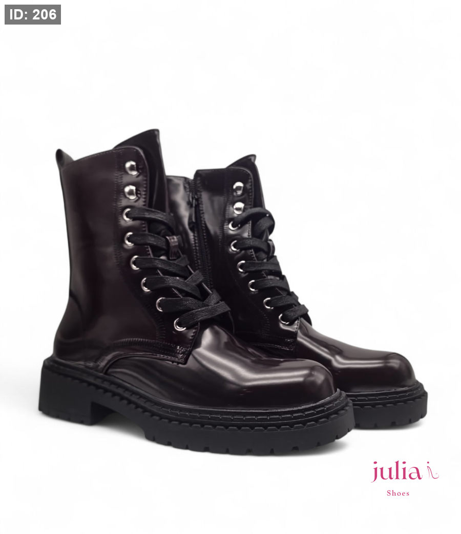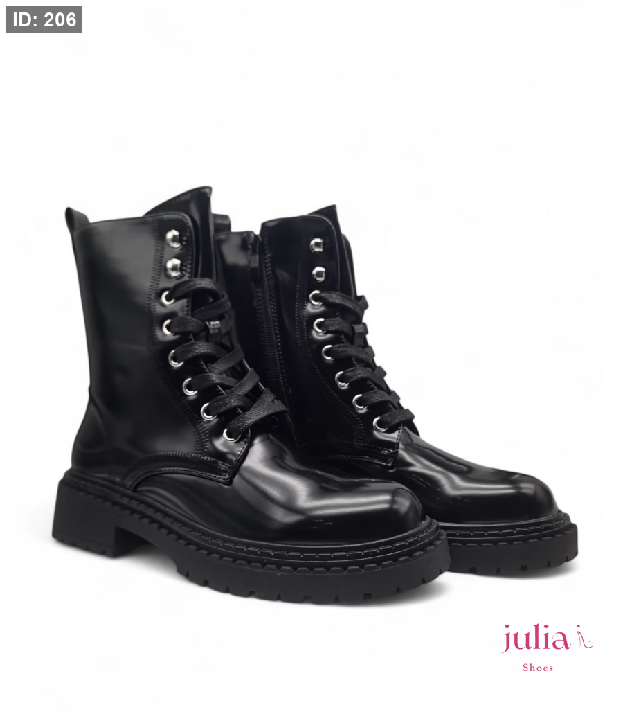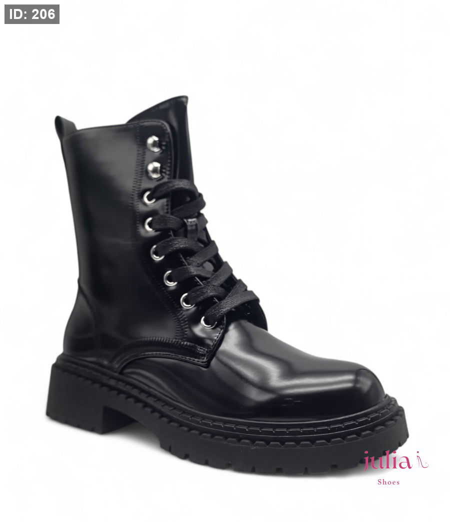Sturdy lace-up combat boots with metallic eyelets and chunky sole.