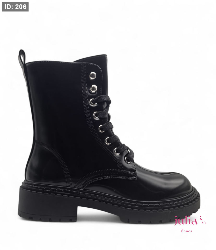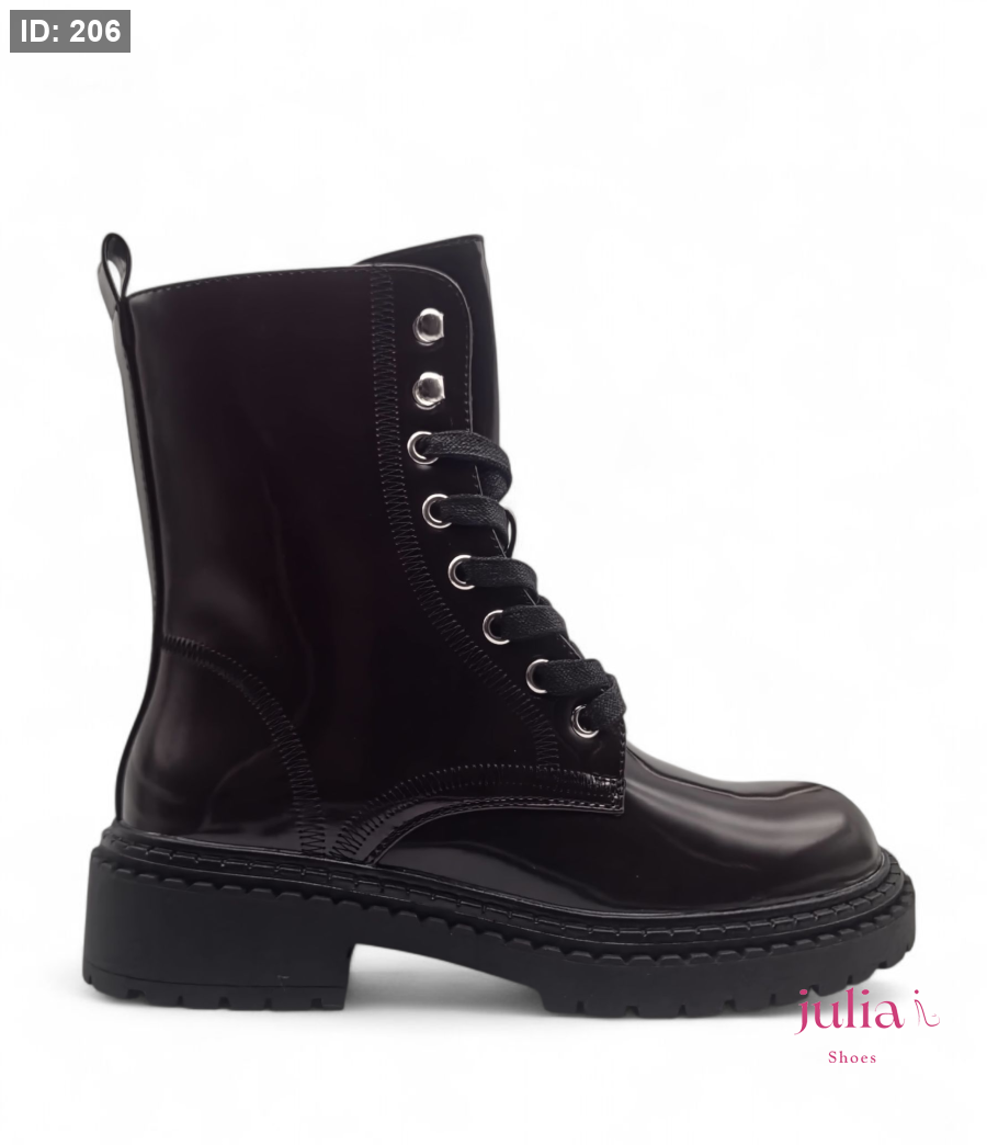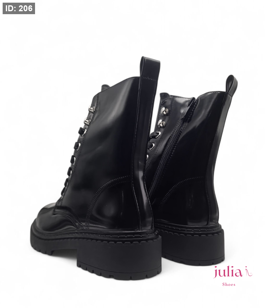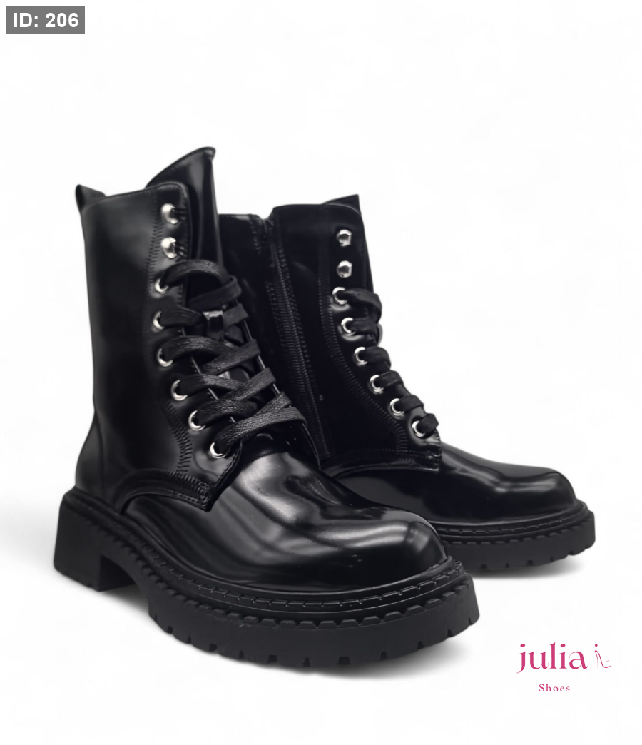 Sturdy lace-up combat boots with metallic eyelets and chunky sole.