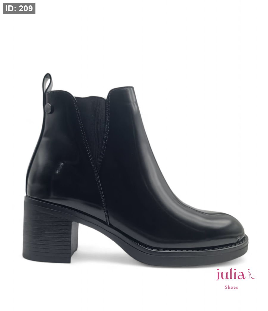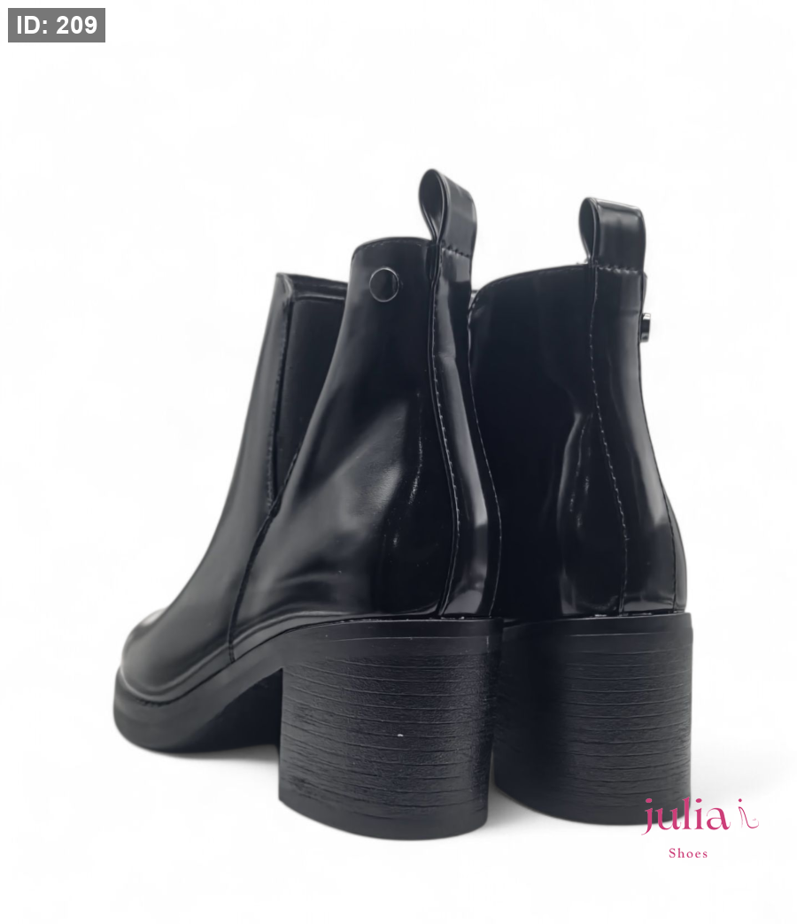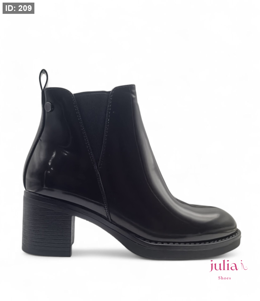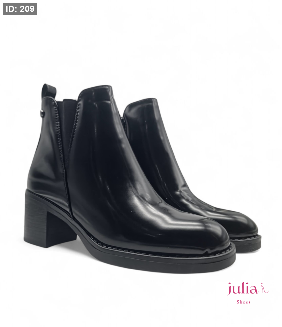 Modern Chelsea boots with a sturdy block heel and glossy finish.